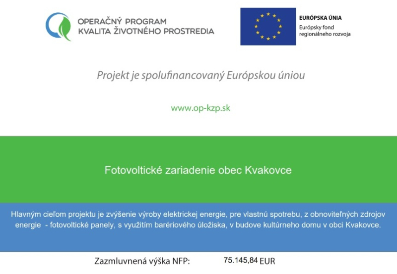 Obec Kvakovce realizuje projekt pod názvom ,,Fotovoltické zariadenia Obec Kvakovce", ktorý je spolufinancovaný Európskou úniou. Hlavný cieľom projektu je výroba elektrickej energie pre vlastnú potrebu z obnoviteľných zdrojov energie - fotovoltické panely, s využitím batériového úložiska v budove Kultúrneho domu v Obci Kvakovce.
