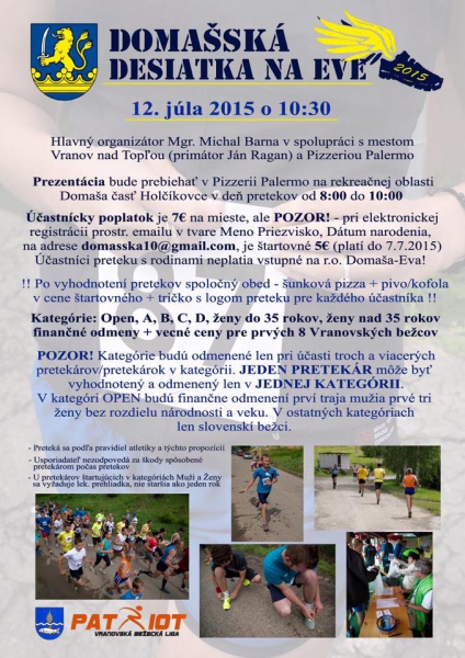 V nedeľu, 12. júla o 10.30 hodine sa v rekreačnej oblasti Domaša Eva uskutoční tradičné bežecké podujatie Domašská desiatka. Organizátorom je Michal Barna v spolupráci s primátorom mesta Vranov Jánom Raganom. Viac informácií v článku na plagáte alebo na telefónnom čísle 0915 878 930.