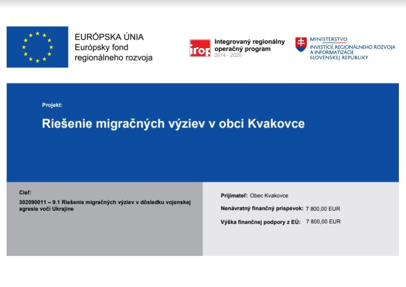 Obec Kvakovce realizuje projekt spolufinancovaný Európskou úniou na základe podpísanej Zmluvy o poskytnutí nenávratného finančného príspevku č. IROP-Z-302091DDQ5-91-108.
