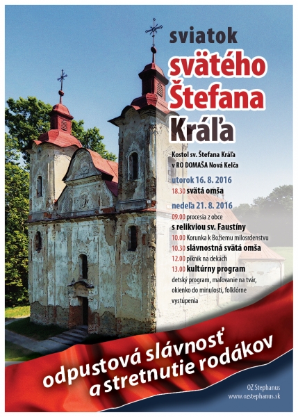 V nedeľu, 21.8.2016 sa v kostolíku na Novej Kelči uskutoční Odpustová slávnosť a stretnutie rodákov zo zatopených obcí. Procesia z obce Nová Kelča začne o 9.00 hodine. O 10.30 sa uskutoční Svätá omša.