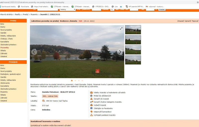Informácie uvedené v inzeráte sú nepravdivé a zavádzajúce. Podľa platného Územného plánu obce Kvakovce v znení neskorších zmien a doplnkov sa na pozemkoch, ktoré sú ponúkané verejnosti na odpredaj nedajú v žiadnom prípade stavať rekreačné chaty a ani domy.