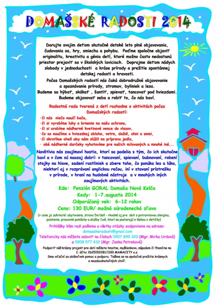 Budú sa hýbať, skákať, šantiť, spievať, tancovať pod hviezdami. V tábore vznikne radostná rada, ktorá bude utvorená z detí a bude rozhodovať o aktivitách počas Domašských radostí.