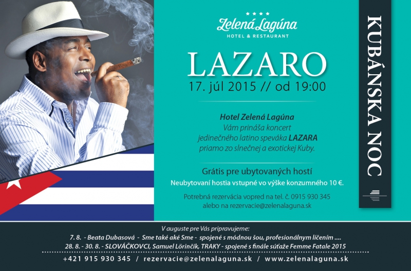 Novootvorený luxusný hotelový rezort Zelená lagúna v rekreačnej oblasti Domaša Dobrá pripravil pre návštevníkov večer plný kubánskej hudby, kubánskych nápojov a výborného jedla. Zabávať vás bude Lazaro, originálny spevák z ostrova slobody.