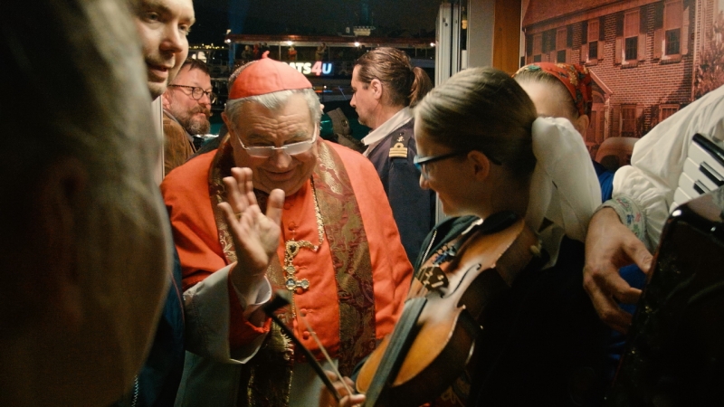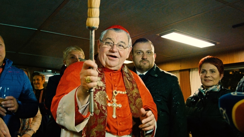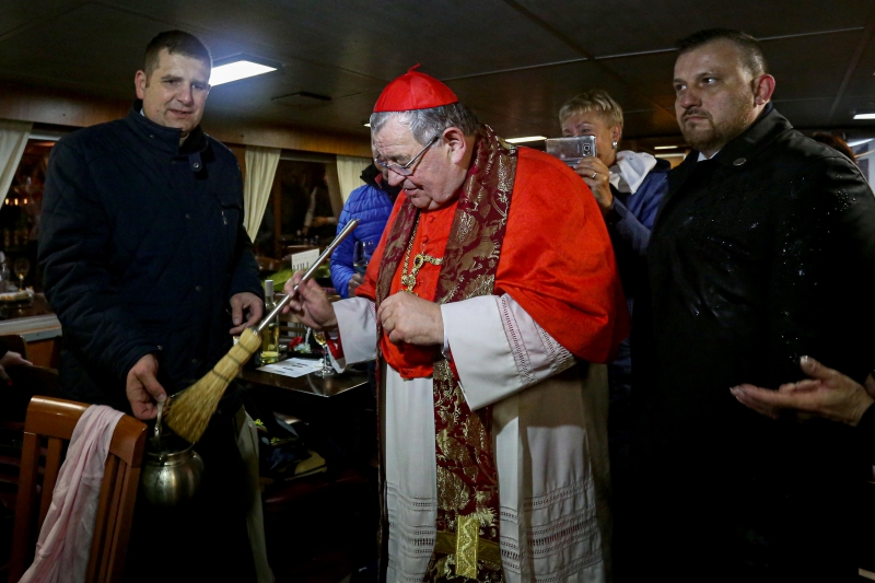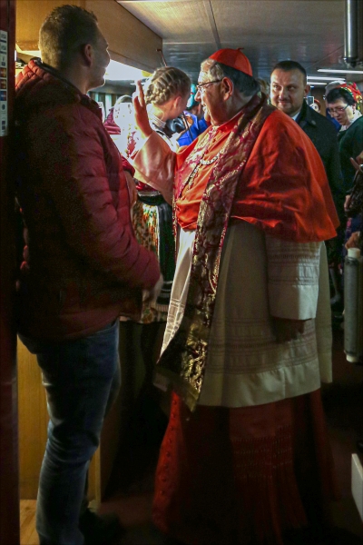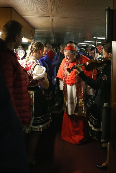 Folklórny súbor Rovina kardinála privítal tradičnými piesňami a ten požehnal plavbu lode okrem pódia aj priamo na jej palube. Asi po pol hodine sa delegácia zo Slovenska rozlúčila so vzácnym hosťom tradičnou ľudovou piesňou.