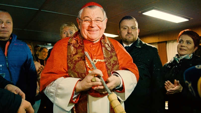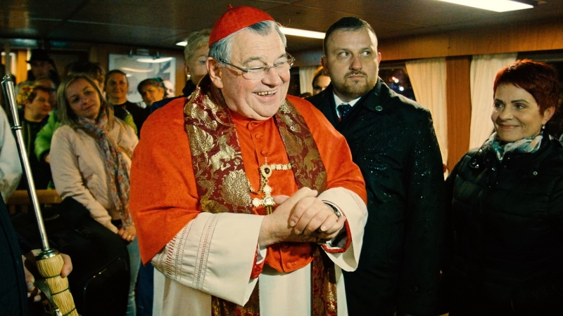 na loďke so zelenou strechou sa dopravil kardinál na loď Bohemia