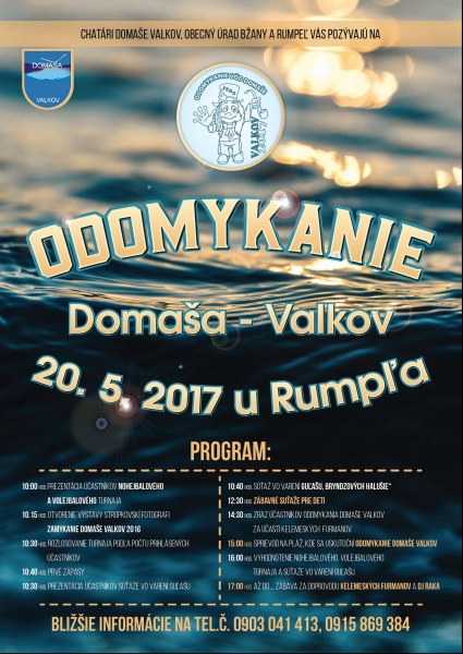 Letná turistická sezóna sa nezadržateľne blíži a s tým je spojený tradičný rituál Odomykania vôd Domaše s vodníkom Ferom. Už tento víkend, t.j. 20.5.2017 je v rekreačnej oblasti Domaša Valkov pripravený bohatý kultúrny program. Rôzne súťaže pre deti aj dospelých. Program si pozrite na plagáte.