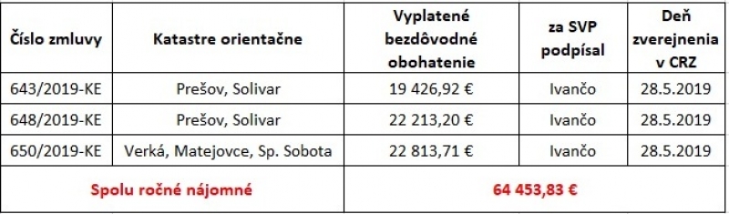 Tri zmluvy na vyplatenie bezdôvodného obohatenia podpísal samotný generálny riaditeľ SVP p. Stanislav Gáborík. Ďalšie zmluvy už podpisoval riaditeľ z odštepného závodu SVP v Košiciach p. Roman Ivančo. Je potrebné uviesť, že všetky pozemky, ktoré sa týkajú vyplácania bezdôvodného obohatenia aj nájmov spadajú do pôsobnosti Košického závodu.