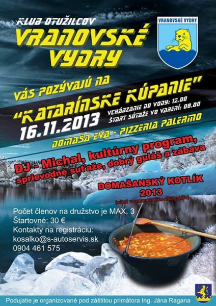 Vranovské vydry pripravili zaujímavé Domašské podujatie "Katarínske kúpanie" a "Domašanský kotlík". Kto chce, bude sa kúpať a pre koho je voda studená, môže sa zúčastniť súťaže vo varení guľáša. V minulom roku sa kúpalo približne 79 ľudí vo vode s teplotou 5 stupňov celzia. Čítajte ďalej.