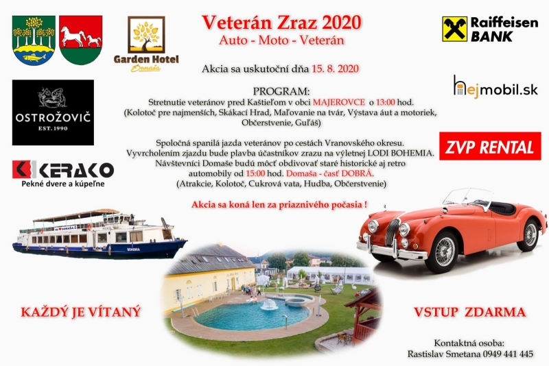 V sobotu, 15. augusta sa v rekreačnej oblasti Domaša Dobrá uskutoční zraz veteránov z celého Východného Slovenska. Zrazu bude prechádzať spanilá jazda veteránov po cestách Vranovského okresu so štartom v obci Majerovce pri kaštieli o 13:00 hodine. Vyvrcholením zrazu bude plavba účastníkov zrazu na výletnej lodi Bohemia. Návštevníci Domaše budú môcť obdivovať staré historické aj retro automobily od 15:00 hodiny na Dobrej.