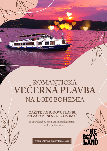 Romantická večerná náučná plavba po Domaši so živou hudbou The Boy´C Band a hitmi, ktoré nikdy nestarnú. Plavba začína o 19.00 hod. a bude trvať približne 120 minút. K dispozícii je aj bar s občerstvením na lodi.
