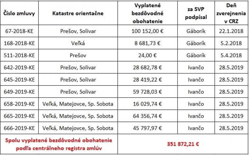 Úzka skupina vlastníkov pozemkov uzatvorila v posledných dvoch rokoch viaceré kontroverzné zmluvy s SVP na výplatu stoviek tisíc eur. Zaujímavé je, že vo väčšine prípadov sa jedná o identické osoby (konkrétne dve) alebo týmto osobám podriadenú firmu so sídlom v Košiciach.