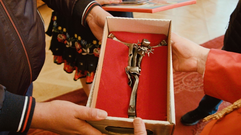 Odovzdali mu dary, medzi inými aj ručne ukutý kríž s podobizňou Ježiša Krista, ktorého autorom je umelecký kováč Michal Kačmár, autor viacerých sôch na Domaši aj v Prešove. Kríž ukul špeciálne pre túto príležitosť.