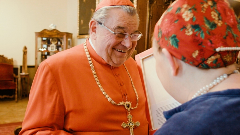 starostka Dlhého Klčova Ľubica Zubková odovzdáva kardinálovi pozdravy od ich pátra Jána, ktorý bol spolužiakom otca arcibiskupa.