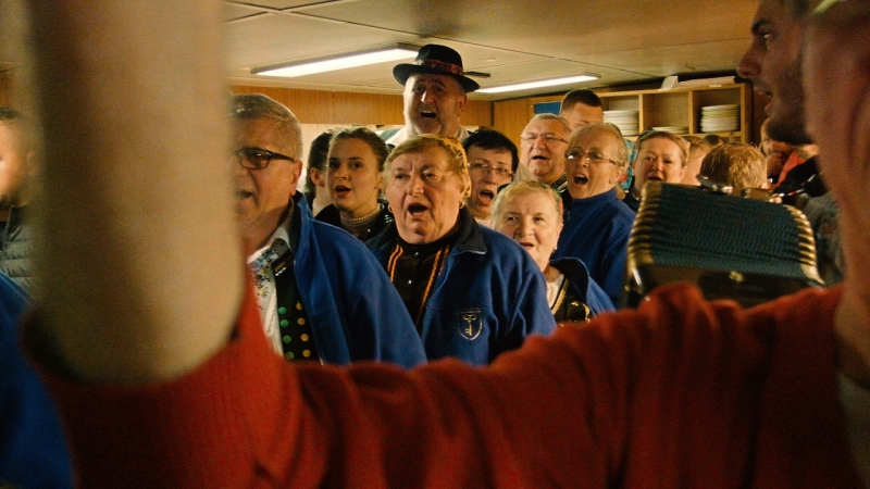 Folklórny súbor Rovina kardinála privítal tradičnými piesňami a ten požehnal plavbu lode okrem pódia aj priamo na jej palube. Asi po pol hodine sa delegácia zo Slovenska rozlúčila so vzácnym hosťom tradičnou ľudovou piesňou.