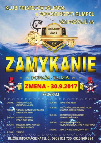 Klub priateľov Valkova a pohostinstvo Rumpeľ Vás pozývajú na Zamykanie vôd Domaše na Valkove, ktoré sa ustkutoční v sobotu, 30.9.2017 so začiatkom od 9.00 hodiny. Na celý deň je pripravený bohatý kultúrny program, ktorý vyústi sprievodom o 14.30 hodine sprievodom na pláž. Pozrite si podrobný program.